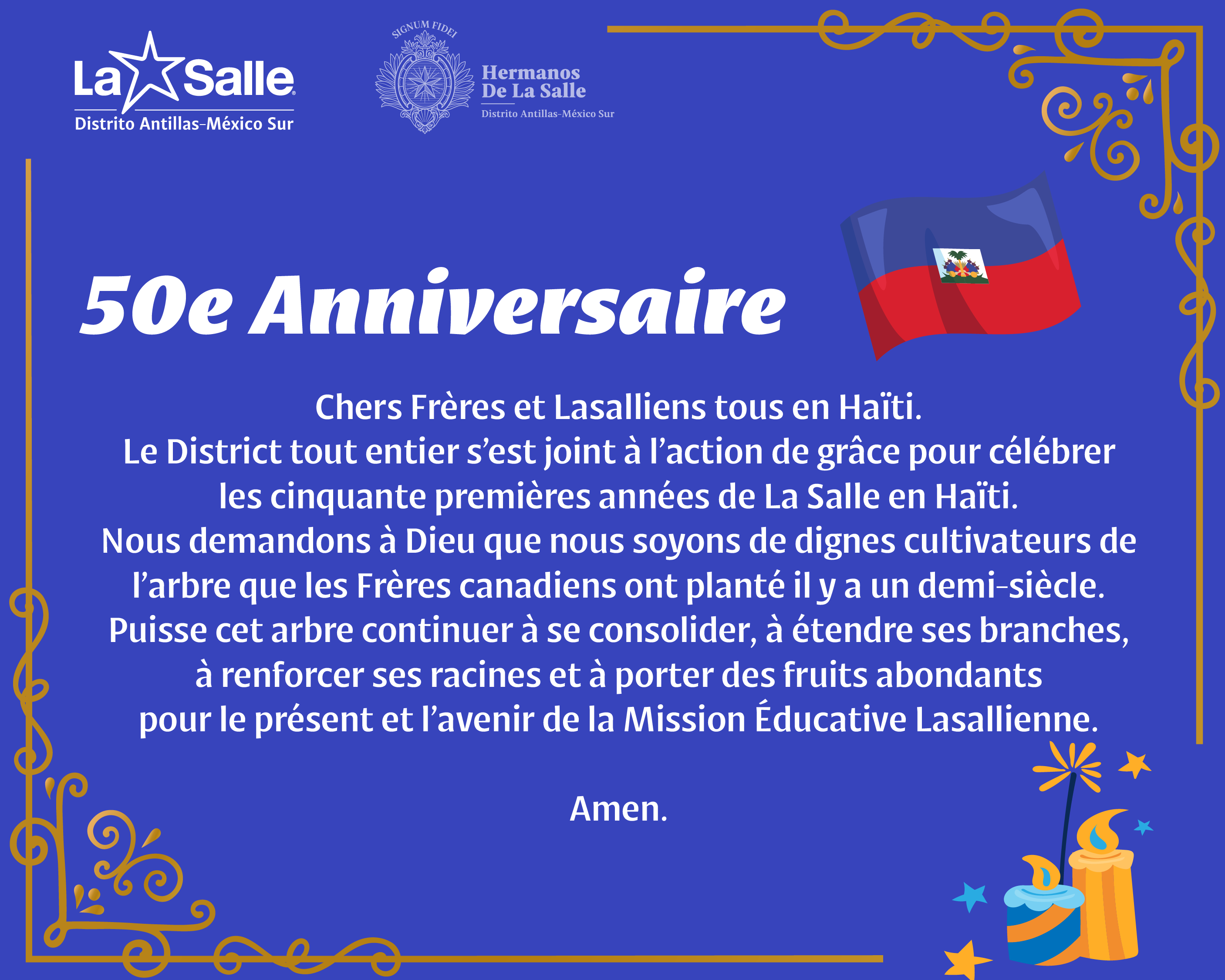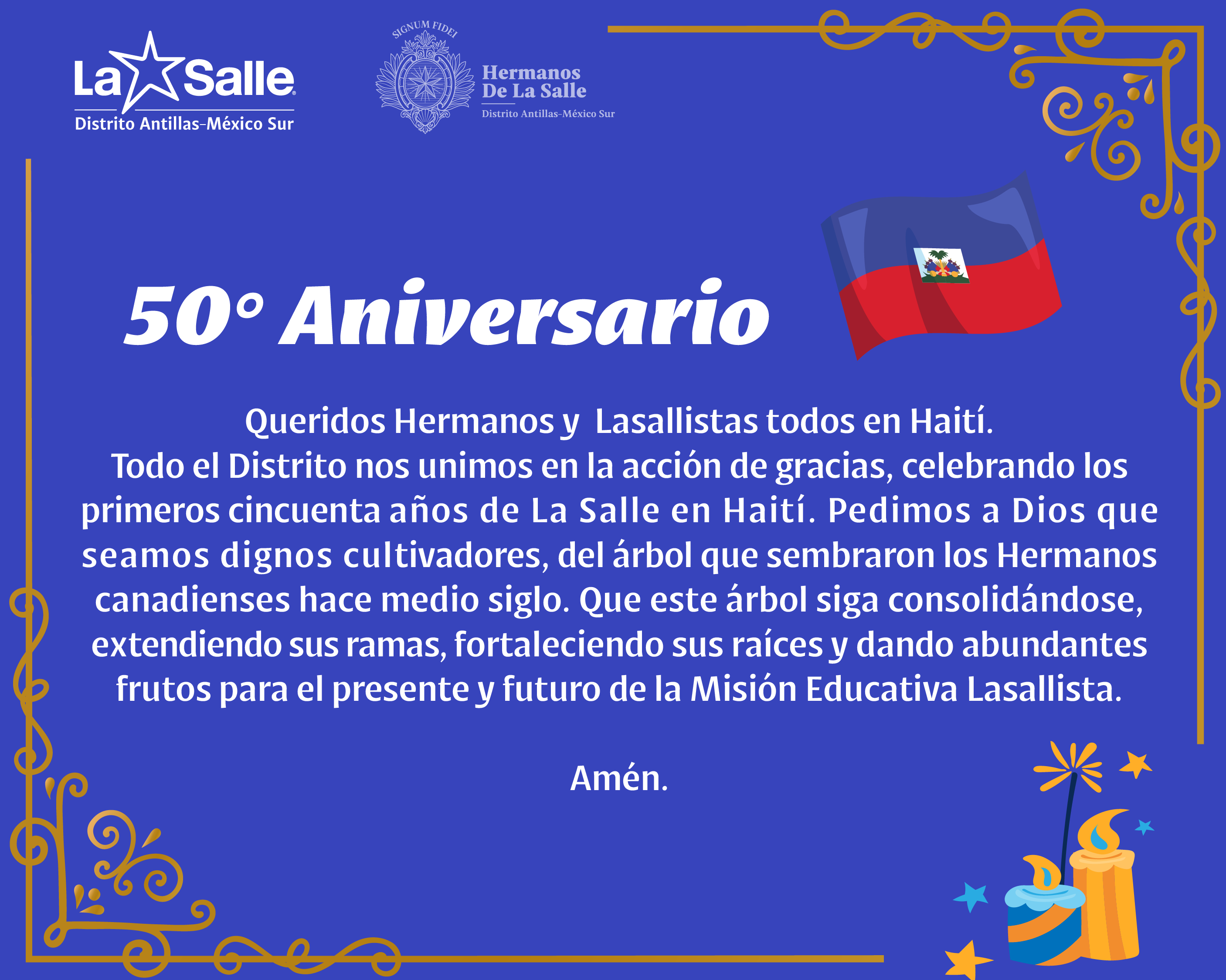 En nuestro Distrito Interés Lasallista 50- Aniversario de la presencia Lasallista en Haití (Comunicación DAMS) 2 años atrás 50- Aniversario de la presencia Lasallista en Haití En el marco de este Aniversario recordamos la visita hecha hace algunos meses por nuestro querido Hno. Superior General Armin Luistro y el Hno. Visitador Distrital José Francisco Flores Gamio.