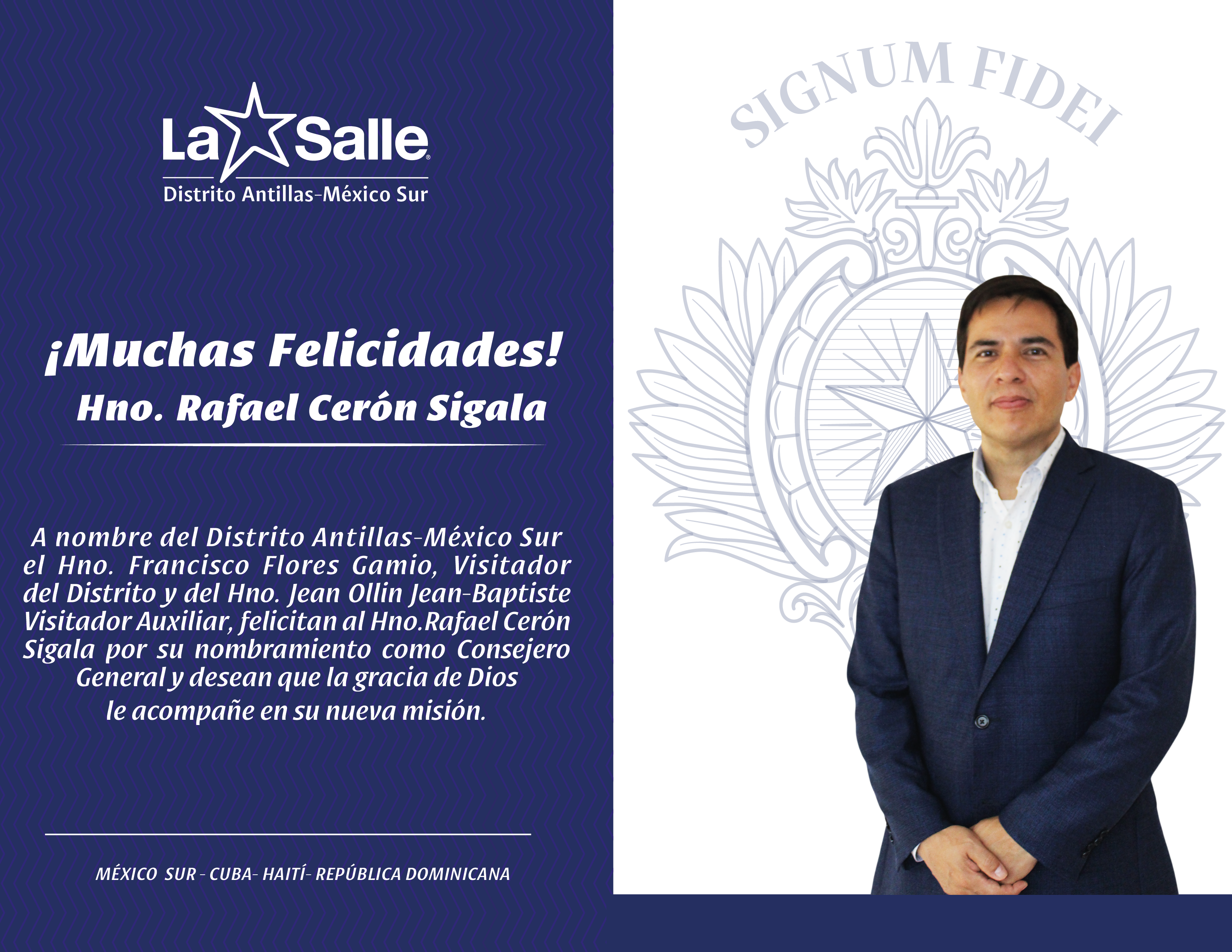 1. Muy estimado Hermano Rafael Cerón, a reserva de hacerlo de manera personal, quiero felicitarte por esta importante designación del Hermano Superior General, seguros que el Espíritu Santo iluminará tu camino; Jesucristo y el Evangelio te orientarán en la gravedad y la ligereza cotidiana; y el Padre se mantendrá en su bondad, como la esperanza en las metas que la obra lasallista impondrá al ser Consejero General.